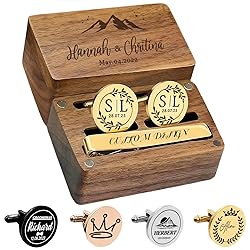 - Elevate his style with our Custom Monogram Cufflinks & Tie Clip Set. Crafted from premium stainless steel, this personalized gift set includes two engraved cufflinks and a matching tie clip, presented in an elegant wooden box. As a wedding gift for groom, father of the bride gift, or groomsman gift. Featuring a secure swivel mechanism, these tarnish-proof cufflinks are ideal for both formal events and business occasions. The easy customization process allows you to create unique initial cufflinks for men, making this set a thoughtful choice for Father's Day, proposals, or as a special gift for son. Versatile and sophisticated, these cufflinks (gemelos para camisa de hombre) combine meaningful personalization with lasting quality