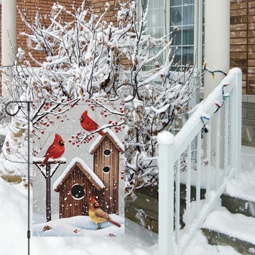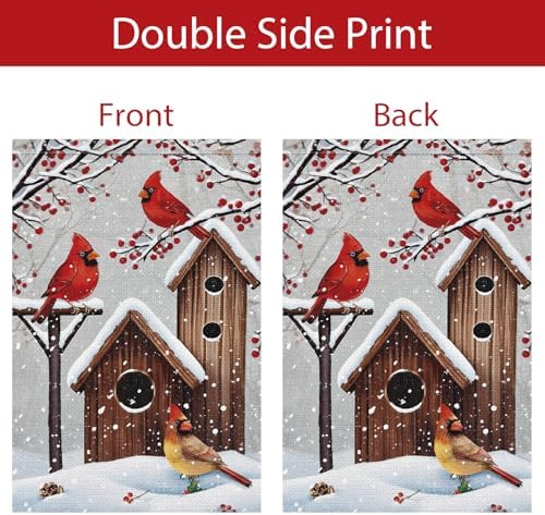 - Charming Winter Birdhouse Scene:Brighten your home with this delightful winter garden flag featuring cozy birdhouse, cheerful red birds, and vibrant red berry branches. This heartwarming design brings a touch of rustic charm and festive spirit to your porch, yard, or doorway during the chilly season