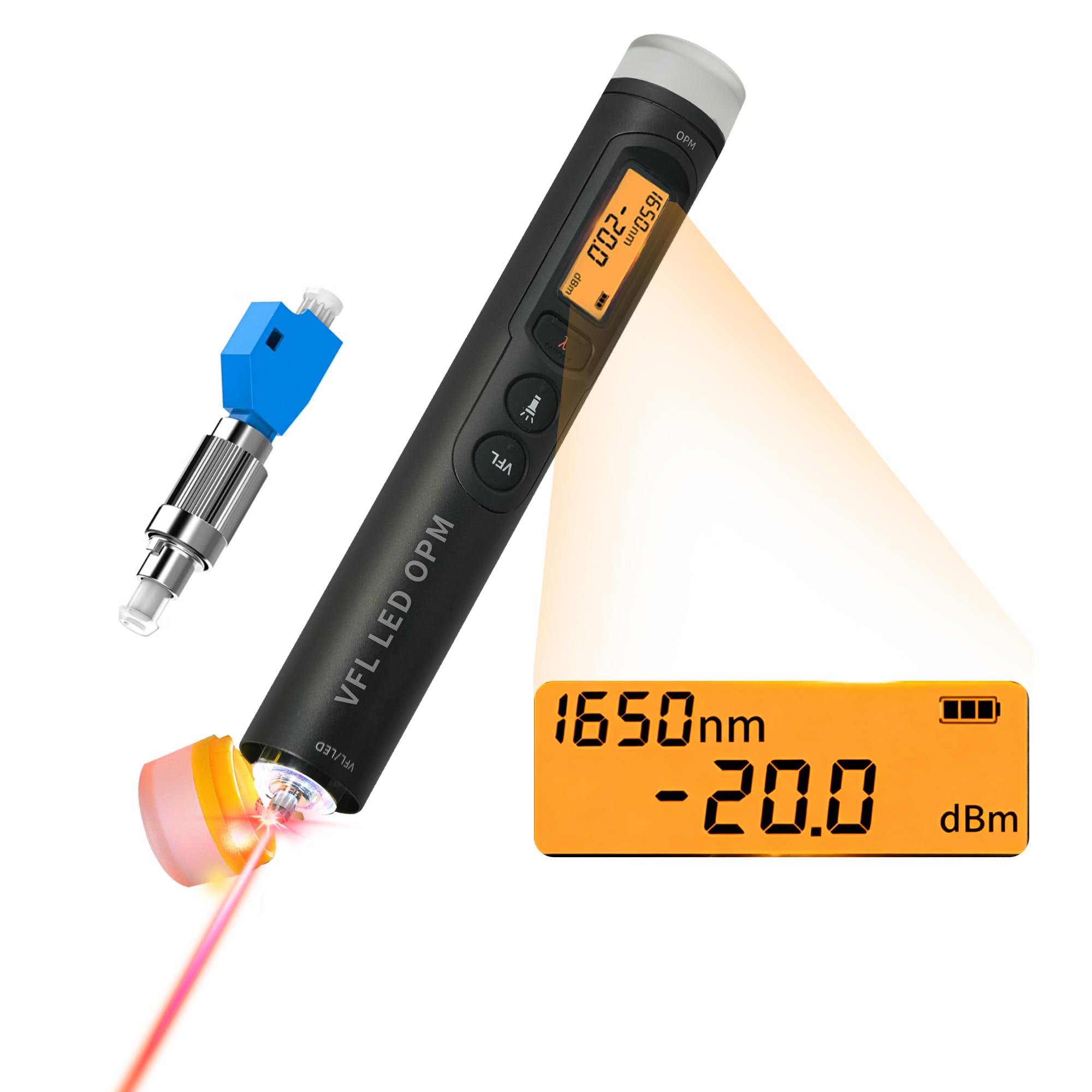 - [3-in-1 Fiber Optical Tester] Combines an Optical Power Meter (OPM), Visual Fault Locator (VFL), and high-brightness LED light in one compact device, simplifying fiber optic testing and fault detection for technicians.