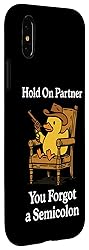Funny cowboy rubber duck saying hold on partner you forgot a semicolon. Perfect for programmers, coders, and software developers who enjoy a humorous take on debugging, coding, and tech life. A fun way to show passion for technology and computer science. Great for anyone in the tech world, whether engineers, students, or IT professionals who appreciate clever designs that highlight coding humor and spark conversation. Two-part protective case made from a premium scratch-resistant polycarbonate shell and shock absorbent TPU liner protects against drops Printed in the USA Easy installation