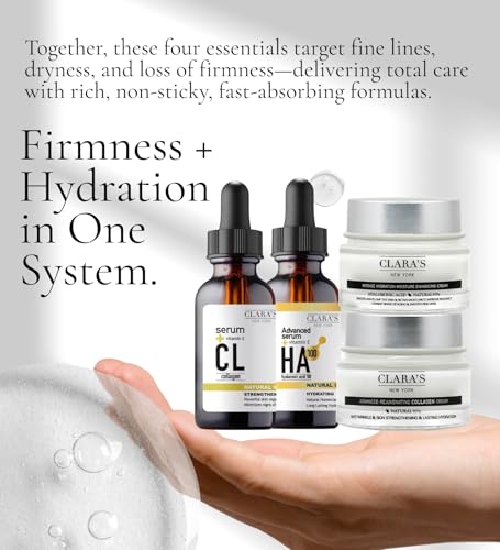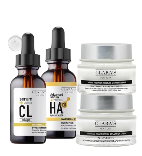 Clara's New York Strengthening Collagen Face Serum Bundle with Hyaluronic Acid 100 Serum 1 Fl Oz each & Collagen Cream + Moisture Enhancing Cream 50 ml – Gift Set (4 Items)