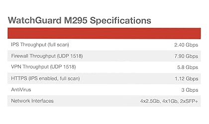 - The WatchGuard Firebox M295 brings enterprise-grade protection to small branches and remote sites. It pairs a compact 1U form factor with an interface mix of 4x 2.5Gb, 4x 1Gb, and 2x 10Gb SFP+ to simplify uplinks and segmentation. Security services include TLS decryption and proxy-based inspection, with UTM throughput up to 1.85 Gbps and HTTPS inspection up to 1.12 Gbps. SD-WAN, dynamic routing (RIP, OSPF, BGP), link aggregation, and high availability options help keep traffic resilient, while WatchGuard Cloud and Dimension provide centralized visibility and reporting.