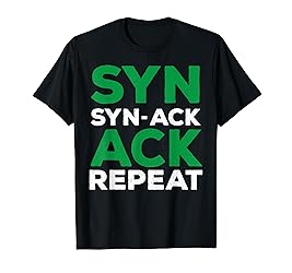 Network admin clothes that says: Syn Syn-Ack Ack Repeat. Network admin outfit perfect for any networks engineers and network admins who love funny computer jokes. Lightweight, Classic fit, Double-needle sleeve and bottom hem