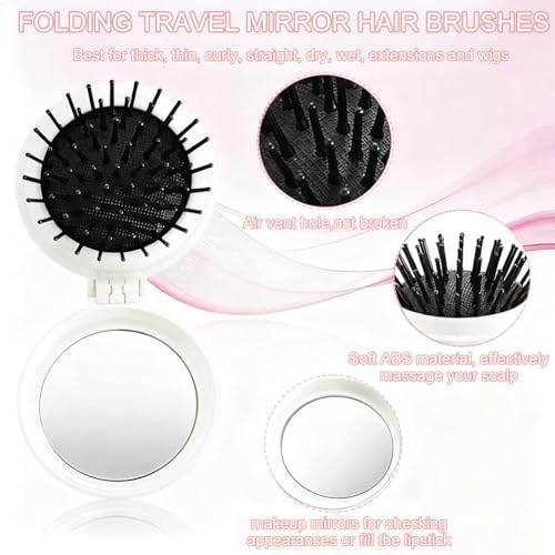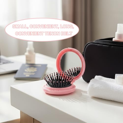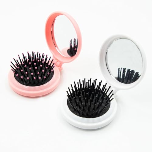 2pcs Cute Mini Foldable Air Cushion Comb for Girls - Portable Hairbrush with Built-In Mirror & Massage Feature,Pink+White