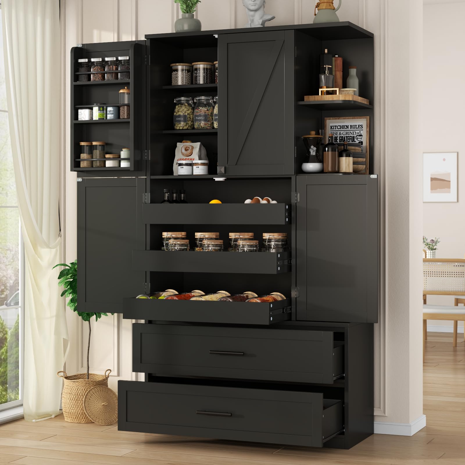 - [Aesthetic Design]: This black cabinet features a vintage-inspired classic design, with gracefully streamlined curves and rounded edges that seamlessly blend modern elegance with retro charm. Its timeless design adds a touch of sophistication to your home decor.Exceptionally versatile, it can effortlessly serve as a coffee hutch, bar cabinet, food pantry, china cabinet, or buffet sideboard, making it the perfect addition to your living room, kitchen and dining room.