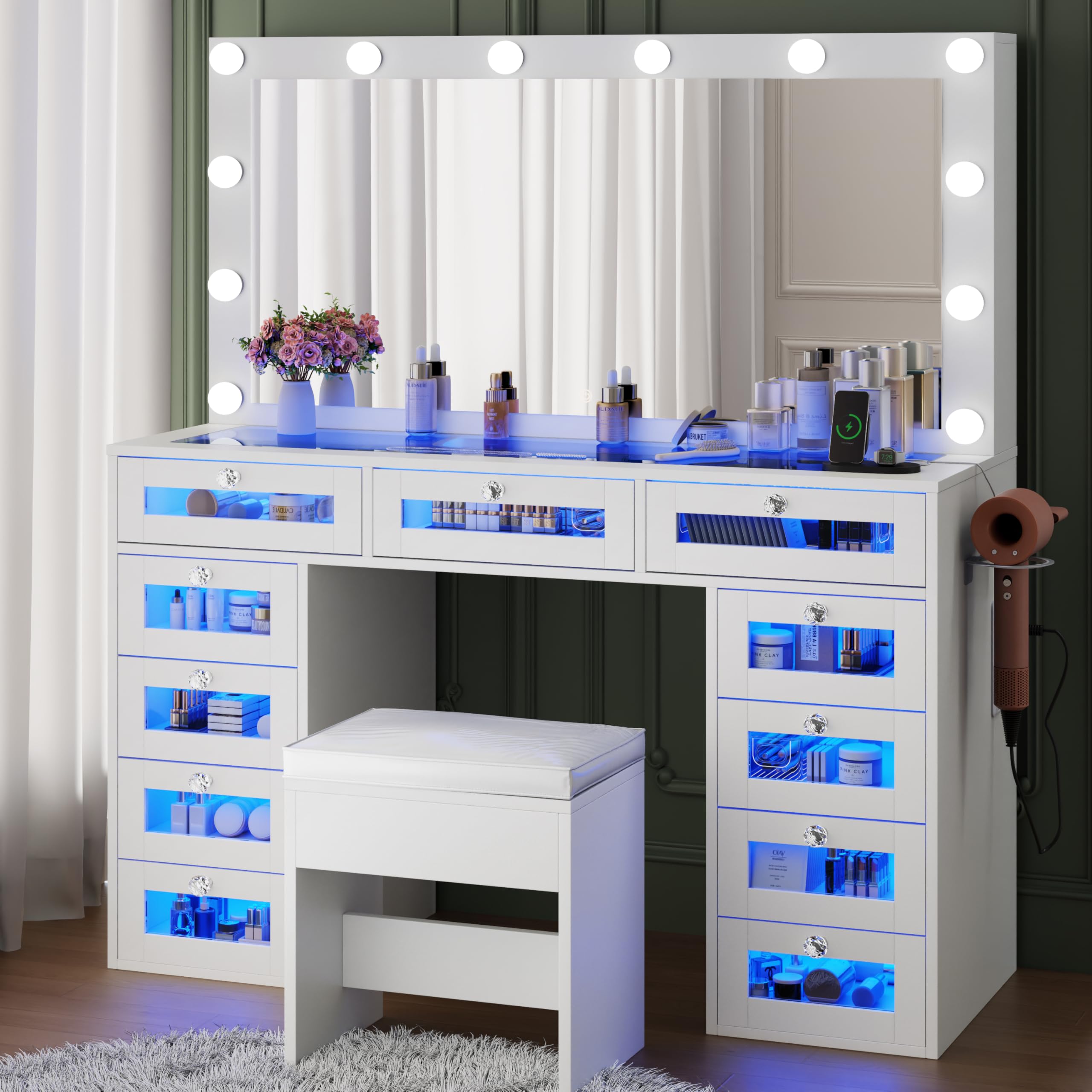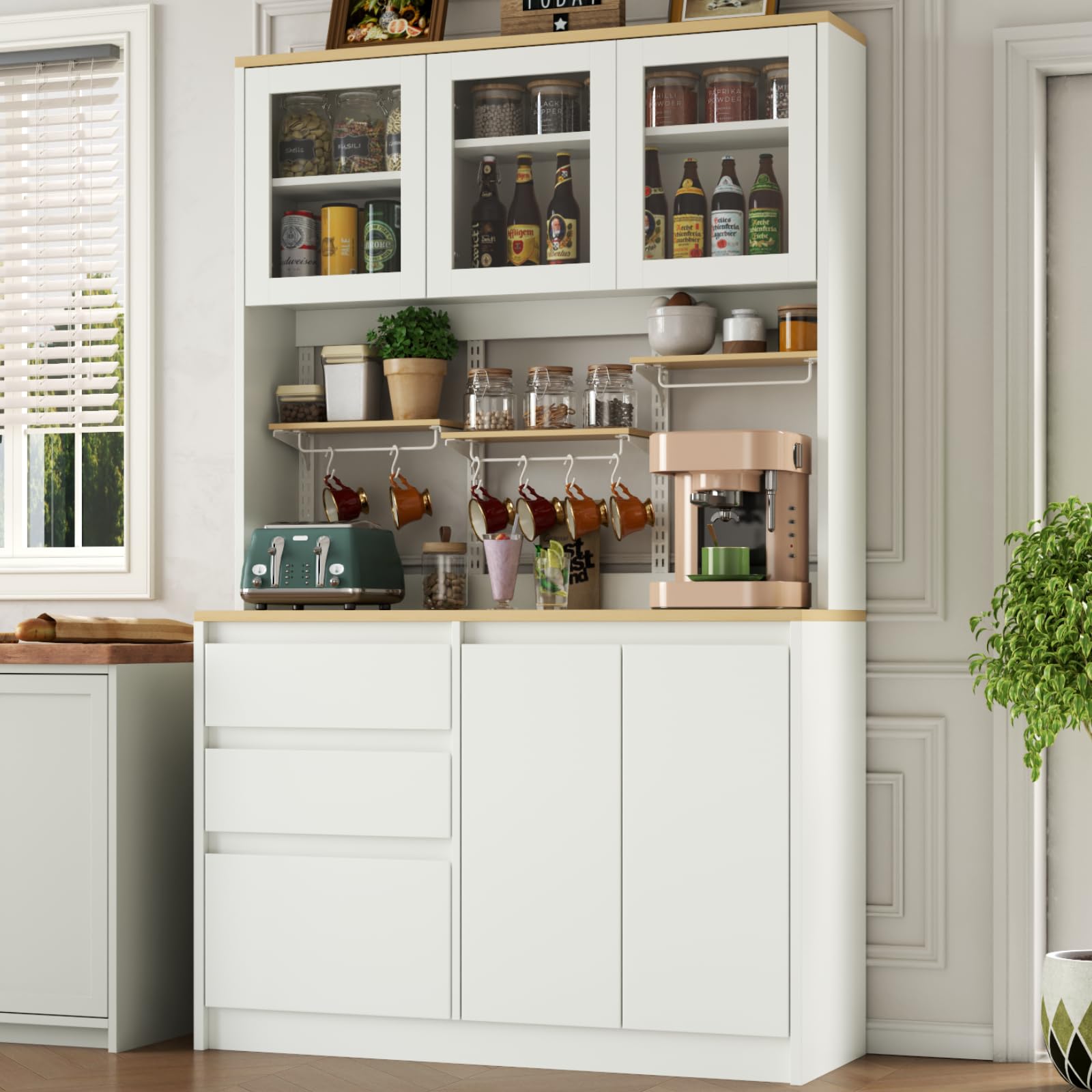- [Perfect Storage Solution]: Our large kitchen cabinet combines a buffet and an upper hutch cabinet, offering roomy compartments to meet all your needs. HD tempered glass offers a clear view of the upper storage, allowing quick identification and easy access at a glance.Plus, 3 large drawers are thoughtfully designed to keep cutlery and condiments neatly organized.