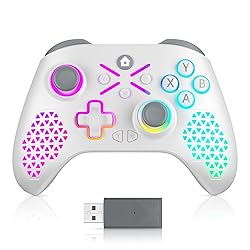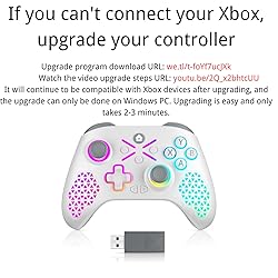 If you encounter problems with the controller connection or technical upgrades, please download the upgrade program to upgrade the controller, or ask the seller for help. 【Upgrade program download link: we.tl/t-foYf7ucJXk】 【Watch the upgrade video tutorial link: youtu.be/2Q_x2bhtcUU】 Tips 1: Please turn off the controller when upgrading, or do not install the battery first. Tips 2: If the connection is disconnected during the upgrade, it may be because the USB port currently inserted is unstable. Please change a USB port and try again. 🎮【Wide Compatibility Platform】- Our wireless xbox one controller with 2.4GHZ wireless adapter for Xbox One/Xbox One S/Xbox One X/Xbox Series X/Xbox Series S Consoles, Steam PC Windows 10/11. Support Wegame, Steam, Epic, Origin game platforms. 2.4GHZ dongle receiver plug and play, ithout the need to install additional drivers. Plug the dongle receiver into the console or computer, pair it with the controller, and automatically adapt to all supported platforms. 🎮【8 Adjustable RGB Lighting Modes】Our wireless xbox controller contains 8 adjustable RGB light modes. You can switch to any of them by just pressing the RGB light setting key. It is very simple and fast. Meet your personalized gaming needs in many ways. And Share button supports capturing and sharing screenshots, recording, etc. 🎮【3.5mm Stereo Jack&Type-C Charging】-Wireless xbox series s controller Support 3.5MM headphones, stereo output, voice calls. Insert a USB cable into the computer or host USB port, and the indicator light of the controller starts to flash slowly, indicating that the controller is being charged. When fully charged, the indicator light of the controller will remain on, indicating that the battery is fully charged. 🎮【Dual Vibration Motor & 360°Joystick】The wireless xbox one controller comes with a dual vibration motor and a 360 ° all-round Joystick.The vibration motor provides precise feedback, making weapons, impacts, and vibrations realistic.360° Omnidiretianal joystick with rapid rebound and higher accuracy.Let you enjoy an immersive gaming experience.