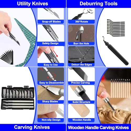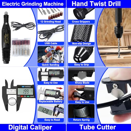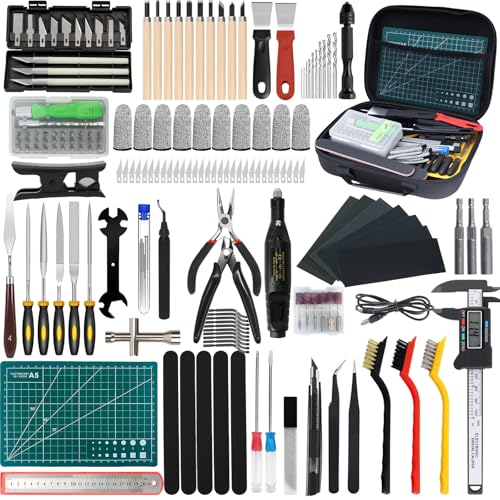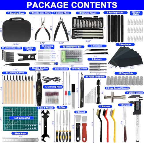 - 【ALL IN ONE PACKAGE】 Includes: 1 pliers, 2 tweezers, 32 screwdriver set, 1 cutting pliers, 1 ruler, 7 sandpaper, 20 cleaning needles, 5 brushes, 2 shovel, 3 sockets, 5 files, 11 trimming knives, 1 electric grinding machine, 12 grinding head, 1 digital caliper, 1 A5 cutting mat, 10 carving knives, 1 socket wrench, 13 carving knives, 30 spare blades, 1 scraper, 1 5-in-1 wrench, 2 screwdriver, 11 utility knife, 1 tube cutter, 11 hand twist drill, 5 sanding sticks, 10 finger cots, 1 carrying case.