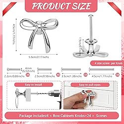 【Elegant Design】These silver cabinet knobs is made of zinc alloy solid, our cabinet knobs offer reliable strength and long-lasting performance without fading or chipping.these drawer knobs feature exquisite bow designs, adding a vintage charm and elegance , showing your unique fashion. we replaced the screws with professional household screws; We provide four sizes of screws for each package, allowing you to select the closest size for a perfect fit without the need for additional trimming. 【Applicable To】:Decorative Bow Knobs Drawer Pullsfeature an elegant silver tone that fully enhances the aesthetic appeal of your drawers or cabinets; Its sleek design and fashionable look are sure to add a touch of elegance and sophistication to any room .These modern furniture handles are ideal for cupboard, door and drawer in the kitchen,living,bedroom cabinet,wardrobe, closet,garage,bar,dresser,room,bathroom and dining area cabinet handles. 【SIZE MEASUREMENT】 Drawer knobs Diameter 2.17"(55.0MM); Height: 1.77"(45.0MM);4 size screw Available options: 0.86"(22MM)&1"(25MM) & 1.38"(35MM)&1.77"(45MM) screws ( The corresponding thicknesses of the wooden boards are :0.5"(13MM)&0.59"(15MM)&0.9"(23MM)&1.38"(35MM);please check the size you need before purchase. 【 ELEGANT BRUSHED SLIVER FINISH 】 The smooth brushed brass surface adds a timeless, luxurious touch to any room. Warm gold tones complement both modern and classic décor while resisting fingerprints and daily wear.Every kitchen drawer pulls dresser knobs for girls is individually wrapped and bagged prevent bumps and scratches to protect the beautiful color. 【TIMELESS GIFT】 Metal Knob sets are the finest option for gifting to your loved ones on any occasion and suit every celebration, elegant, unique and durable! These beautiful Knobs come in a nice branded box making it more convenient for gifting.