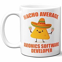 - The ideal funny gift for any Avionics Software Developer! Perfect for coffee, tea, latte or any other hot or cold beverage, this awesome 11 ounce mug features a large, comfortable handle, is made from high quality, dishwasher & microwave safe ceramic which means that the graphics will never fade even after thousands of uses. Mug Reads: "Nacho Average Avionics Software Developer."