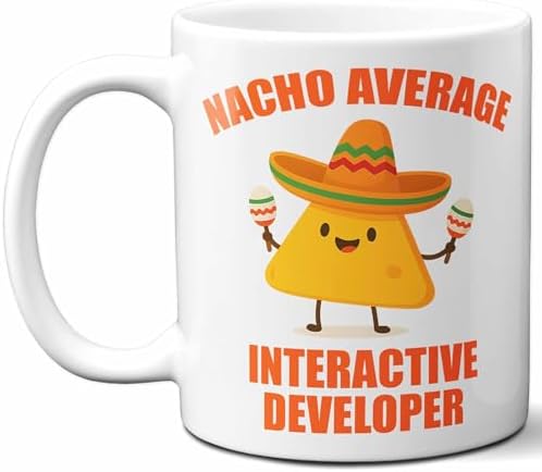 The ideal funny gift for any Interactive Developer!Perfect for coffee, tea, latte or any other hot or cold beverage, this awesome 11 ounce mug features a large, comfortable handle, is made from high quality, dishwasher & microwave safe ceramic which means that the graphics will never fade even after thousands of uses.Mug Reads: "Nacho Average Interactive Developer."