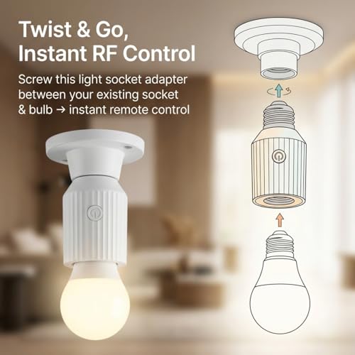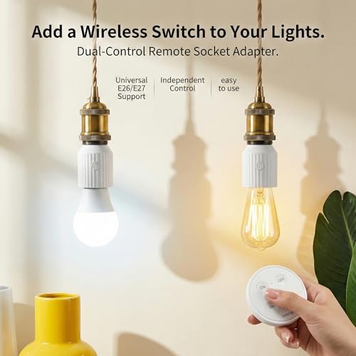 - ✦ Ready-to-Use Pre-Paired System – Two sockets and remote arrive pre-synced. Simply screw into E26/E27 fixtures and start controlling both lights instantly. No app downloads, no WiFi setup, no pairing hassles.