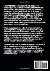 - Master Fedora Linux like a professional — from powerful workstation setups to secure, container-ready deployments. Whether you’re a developer, sysadmin, or Linux power user, this hands-on guide gives you the tools to build, optimize, and automate Fedora 42+ systems with confidence. Mastering Fedora Linux is your complete guide to unlocking the full potential of Fedora, one of the most advanced and developer-friendly Linux distributions available today. This book blends practical, real-world instruction with modern Fedora technologies including Silverblue, Podman, Flatpak, and SELinux. Each chapter focuses on actionable knowledge — from system installation and customization to performance tuning, server management, and container orchestration — ensuring that every concept can be immediately applied in production or personal workflows.Whether you’re securing a development workstation, deploying Fedora in a hybrid environment, or managing containers with Podman and Fedora CoreOS, this guide equips you with the expertise needed to master Fedora’s evolving ecosystem. Learn how to automate updates, configure resilient servers, integrate with Windows and macOS environments, and maintain long-term system stability using professional best practices.Key FeaturesBuild, configure, and customize Fedora 42+ for workstation and server environments.Master modern Fedora technologies such as Silverblue, Podman, and Flatpak.Strengthen system security with SELinux, firewalld, and advanced user management.Automate updates, backups, and containerized deployments with real-world examples.Optimize performance and troubleshoot common issues with proven techniques. Kendrick A. Carroll is a Linux systems expert and technical author specializing in open-source infrastructure, automation, and security. With years of experience in Fedora-based environments, he focuses on writing clear, practical guides that empower readers to master real-world technologies. Take control of Fedora Linux today. Whether you’re building your first workstation or managing enterprise-grade servers, Mastering Fedora Linux is the essential guide to building, securing, and optimizing your Linux systems with confidence and precision.