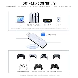 【Vibration Function】This PS5 converter supports motor vibration functionality on PS5/PC platforms. Whena compatible game controller is connected to a PS5 or PC via this converter, thebuilt-in motor vibration feature of the controller will be retained and functionnormally. Users can experience authentic haptic feedback in games that supportvibration,enhancing theimmersive gaming experience 【Voice Function】On the PS5 console,the PS4 controller (DualShock 4) supports voice functionalityBy connecting headphones or a headset to the controller's 3.5mm audio jack, userscan enable voice chat, audio input, in-game voice commands, and real-timecommunication with other players, enhancing the interactive experience inmultiplayer games 【Motion Sensing Function】On the PS5 console, both the PS4 controller and the Switch Pro controller supportmotion sensing functionality 【Enhanced Function】In customization mode, you can configure advanced features such as buttonremapping, Turbo rapid-fire, and combo macros. Below is a detailed guide on howto activate customization mode and perform specific settings within this mode 【Extended Wireless Range】Wireless Converter integrated with Bluetooth V5.3, ensuring stable & reliable connectivity up to 33.3 ft (10 m) away. Actual range may be affected by any physical obstructions 【Note】Please read the instruction manual carefully before use!This controller converter is only compatible with the official controllers and does not support other series of controllers or third-party manufacturedcontrollers.Xbox One S/X Controller, Xbox Series X/S Controller, and Xbox Elite Series 2 EliteController need to be updated to the latest version on an Xbox One series consolebefore pairing and use