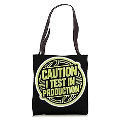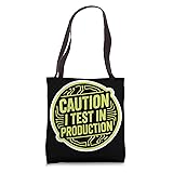 Make a statement that programmers will appreciate, warning of testing in live environments. For brave coders who live dangerously and push straight to production. 16” x 16” bag with two 14” long and 1” wide black cotton webbing strap handles. Made of a lightweight, spun polyester canvas-like fabric. All seams and stress points are double-stitched for durability, and the reinforced bottom flattens to fit more items and hold larger objects. Spot clean/dry clean only.