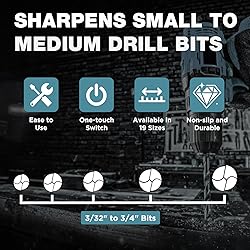 BIT SHARPENING: Designed for woodworkers, metalworkers, and DIY enthusiasts to sharpen dull bits, Suitable for a variety of project needs WIDE COMPATIBILITY: Sharpens small to medium drill bits, including HSS (high-speed steel) and others, covering from 2.5mm (3/32") to 19mm (3/4") ADJUSTABLE SHARPENING ANGLE: Built-in guide for standard angles (118°-135°) with a adjustable range from 115° to 140° STURDY CONSTRUCTION: Sturdy metal body provides stability for a sharpening process COMPACT AND EASY TO USE: this drill sharpener suit for use at home, DIY, crafting, and small repairs