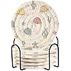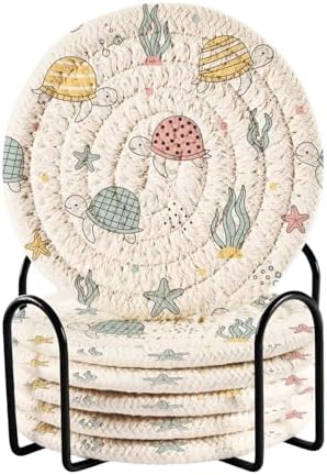 Cartoon Turtle Starfish Print 6 Pcs Absorbent Drink Coasters for Tabletop Protection Handmade Round Woven Coaster with Holder & Heat Water Resistant Bulk Cup Coaster Set for Home Cafe Bar Kitchen