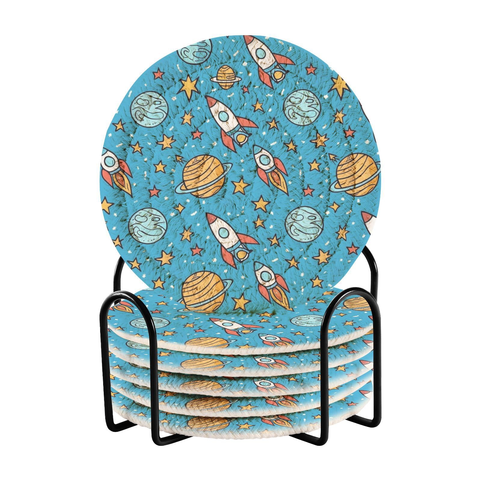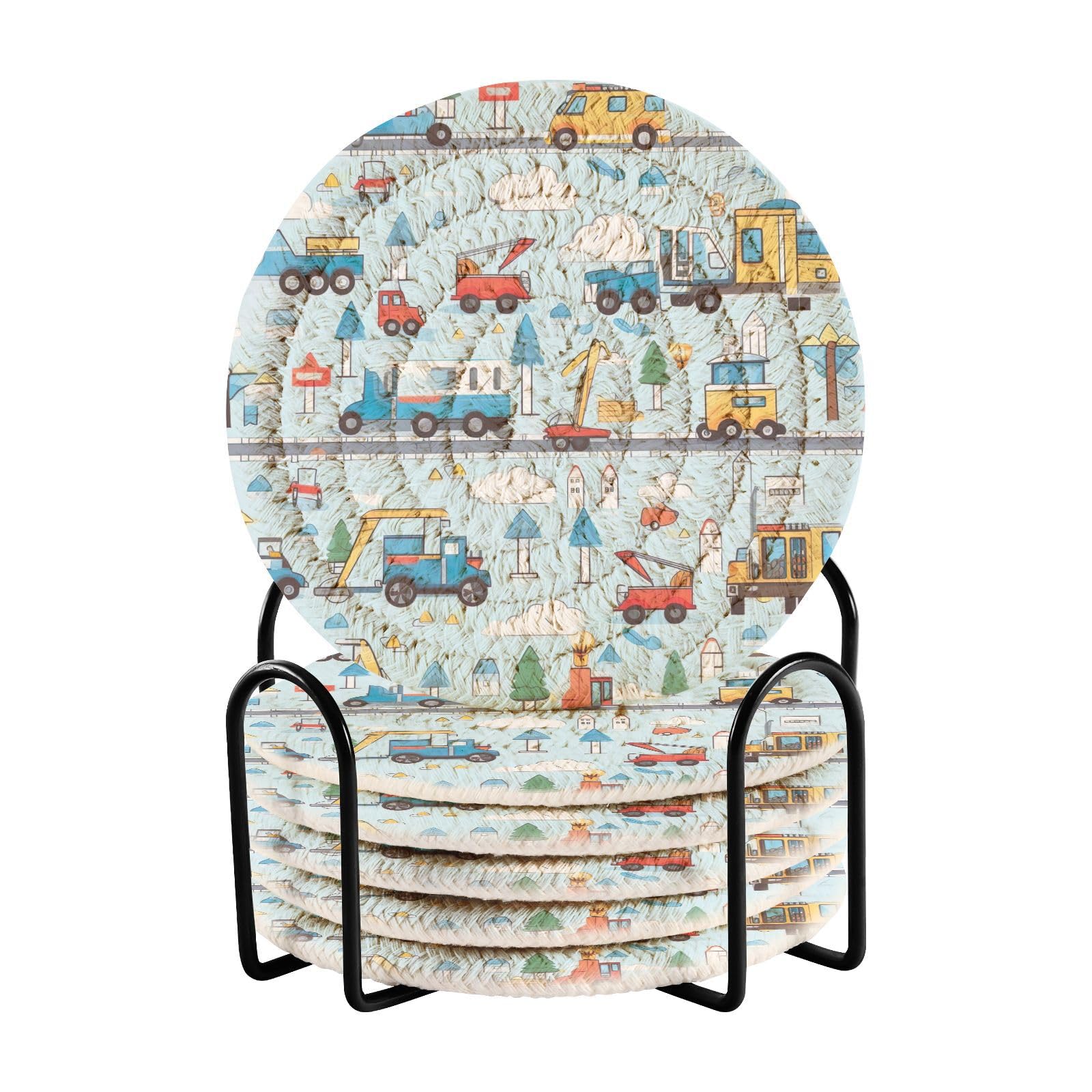Cartoon Monster Trucks Stars Pattern 6 Pcs Absorbent Drink Coasters for Tabletop Protection Handmade Round Woven Coaster with Holder & Heat Water Resistant Bulk Cup Coaster Set for Home Cafe Kitchen