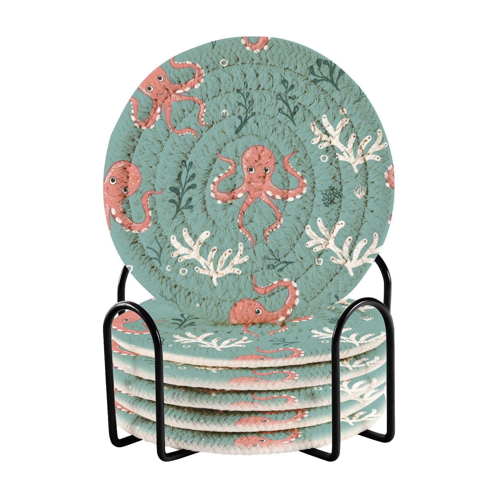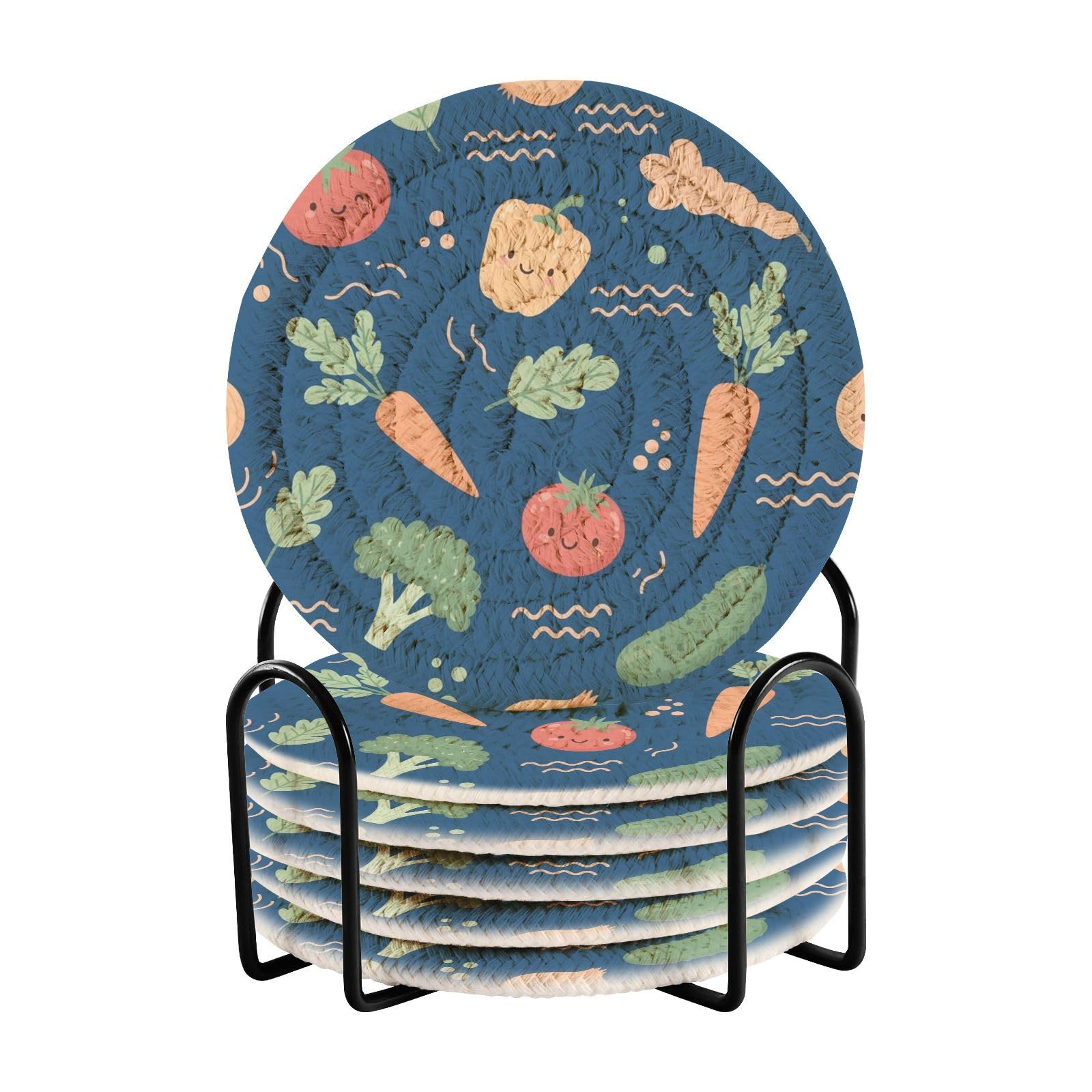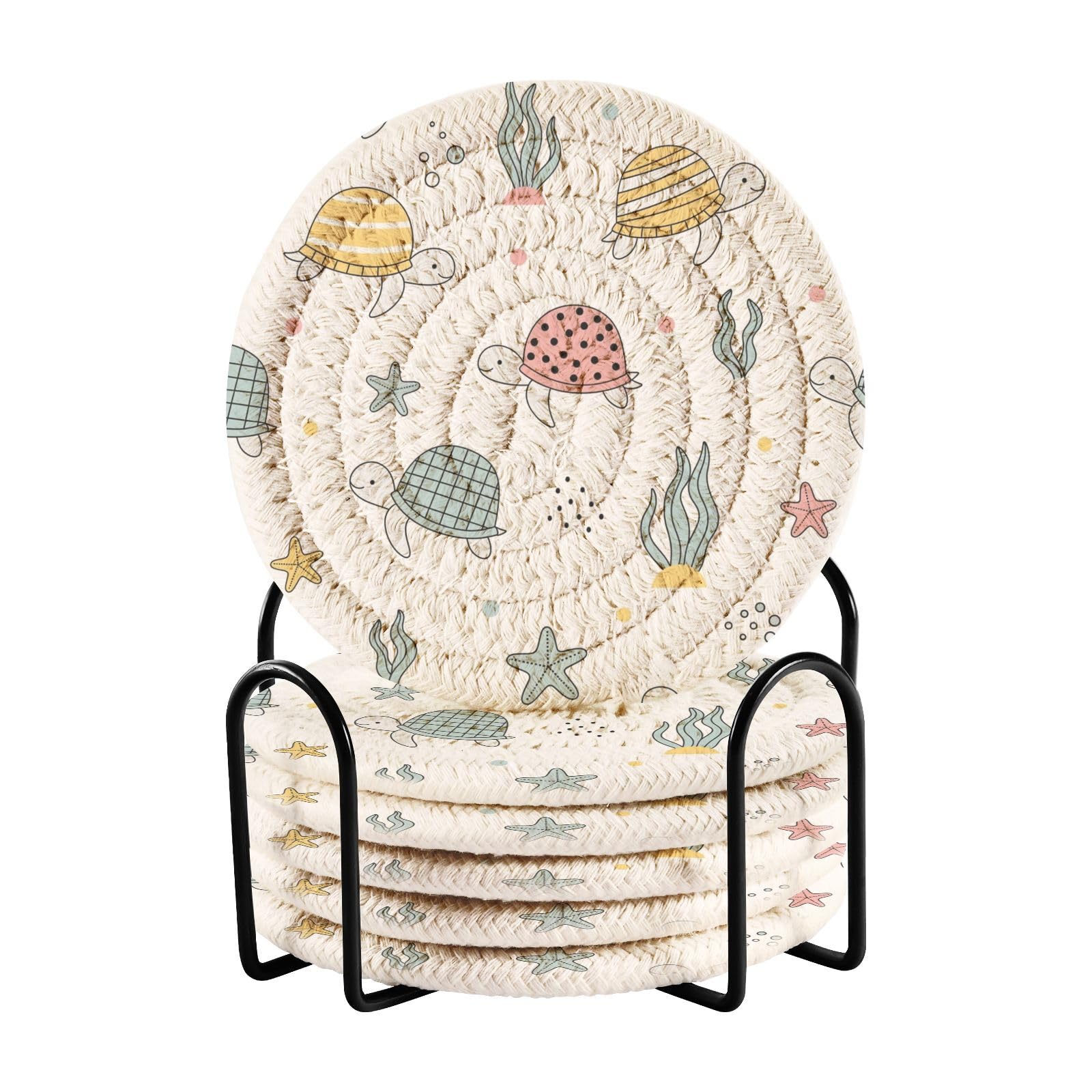 - 【EASY TO CLEAN】- This woven coaster of ours is effortless to clean. Simply wipe with a damp cloth or hand wash with a mild soap and air dry. When not in use, place all woven coasters in the metal holder to ensure a clean and tidy table