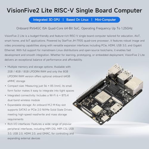 - Powerful and Affordable RISC-V SBC: The VisionFive 2 Lite is a cost-effective single-board computer powered by the StarFive JH-7110S quad-core processor. Its high-performance architecture makes it ideal for educational purposes, AIoT, smart home, and IIoT applications, offering exceptional image and video processing capabilities.
