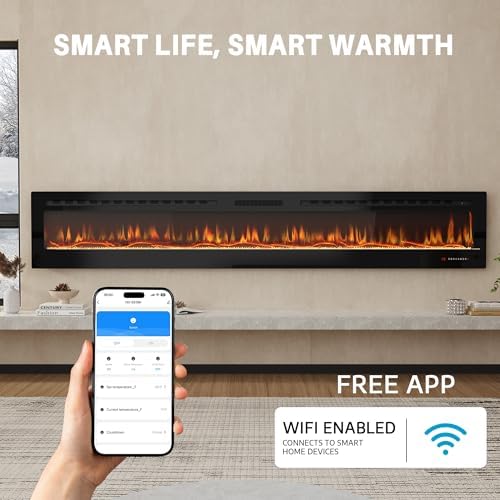 - 【Smart WiFi Control – Works with App】This smart electric fireplace supports intelligent WiFi control through the mobile app, allowing you to adjust flame color, flame brightness, heat mode, and timer anytime, anywhere. Compatible with smart home systems