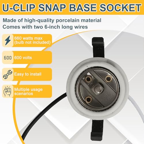 2 Pack U-Clip Porcelain E26 Light Socket, Medium Base E26 Ceramic Light Socket, Snap-in Keyless Lamp Socket with 6" Wire, Heat Resistant, 660w 600v