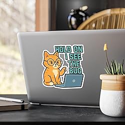 - Programming Sticker – "Hold On I See The Bug" Funny Coding Decals for Developer, Debugging, Vinyl Waterproof Laptop or Water Bottle Accessory | Programming Sticker | Coding Decals | Programming GiftGeek out with coding, debugging, and software skills at your digital workstation. Perfect for any tech nerd or developer who loves computers, scripts, and the internet. Featuring binary vibes, glitches, and feline style with orange glasses flair.Made with high quality white vinyl, these kiss-cut decals deliver great looks that are water, scratch, and UV-resistant. With a removable adhesive that doesn't leave residue, each piece features a 1/8" kiss-cut border around the sticker and a satin finish. Choose between four sizes and bring your art to life. - The stickers are produced on high-quality removable white vinyl. - These stickers are scratch, UV and water-resistant. - The stickers have a satin finish. - The latest printing techniques provide bright and crisp colors matching. - Removable adhesive without residue - Four sizes to choose from - Care Instructions Clean with water and rag. Can be used indoors as well as outdoors with 3 year durability. Apply to any hard smooth surface.
