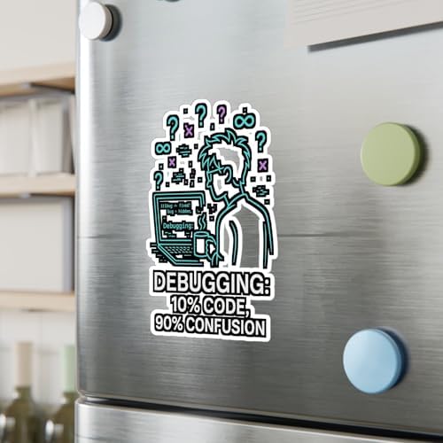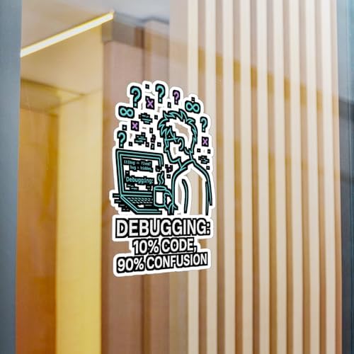 Programming Sticker – Fun "Debugging: 10% Code, 90% Confusion" Decals for Developers & Coders, Waterproof Vinyl for Laptop or Water Bottle | Programming Sticker | Developer Decals | Programming GiftProgramming is life for every developer and coder obsessed with syntax, debugging, scripting, and tech. Embrace the irony, sarcasm, and burnout of a software engineer's workflow, where productivity meets logic inside the IDE, terminal, and keyboard interface.Made with high quality white vinyl, these kiss-cut decals deliver great looks that are water, scratch, and UV-resistant. With a removable adhesive that doesn't leave residue, each piece features a 1/8" kiss-cut border around the sticker and a satin finish. Choose between four sizes and bring your art to life. - The stickers are produced on high-quality removable white vinyl. - These stickers are scratch, UV and water-resistant. - The stickers have a satin finish. - The latest printing techniques provide bright and crisp colors matching. - Removable adhesive without residue - Four sizes to choose from - Care Instructions Clean with water and rag. Can be used indoors as well as outdoors with 3 year durability. Apply to any hard smooth surface.