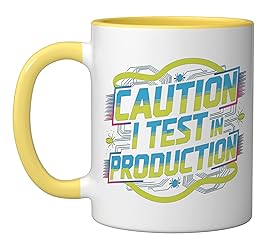 Make a statement that programmers will appreciate, warning of testing in live environments. For brave coders who live dangerously and push straight to production. 11-ounce ceramic mug is dishwasher and microwave-safe, lead and BPA free Features glossy finish with accent colors on interior, handle, and rim of two-tone designs