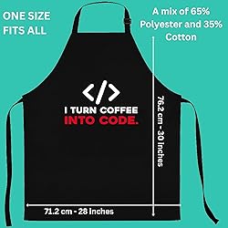 STURDY POLY-COTTON BLEND: Made with a strong polyester and cotton mix to resist stains. Cleans easily in the washing machine. ADJUSTS FOR ALL SIZES: The neck strap slides to adjust and the long ties fit any waist, making it great for everyone. This is designed for those who work in the computer or I.T. field and is printed with the words: I turn coffee into code. Perfect for someone who does web development, coding, etc. Apron This Apron Apron makes a great gift for anyone who is interested in binary code or works in information technology. TWO POCKETS: Two large pockets on the front provide plenty of room for your tools and phone.