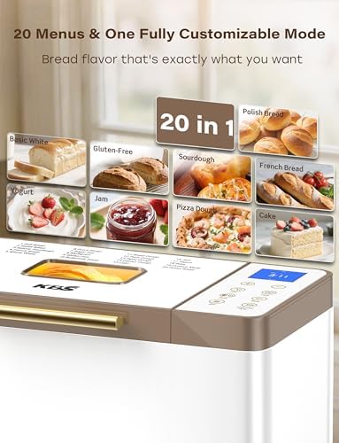 - 20 UPGRADED MENUS FEATURING A SMART CUSTOMIZATION PROGRAM: KBS bread maker comes with 20 menus (Polish Bread/French/Gluten-Free/Dough/Yogurt, etc.)—covering all baking needs. Great for pros, newbies, households, and businesses alike! Bread maker machine lets 100% customize time for every step—So bread tastes perfect for you! It has 6 steps, autolysing, basic rise, degassing(Retains open crumb),re-rise,reshape(Perfectly shaped),last rise,airy no dense. Save settings to custom mode menu 19,One-Touch operation makes same bread. Easy peasy, 0 fails
