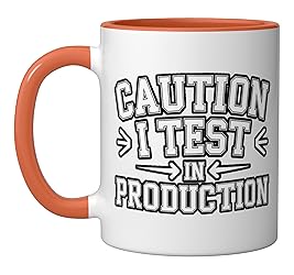 Make a statement that programmers will appreciate, warning of testing in live environments. For brave coders who live dangerously and push straight to production. 11-ounce ceramic mug is dishwasher and microwave-safe, lead and BPA free Features glossy finish with accent colors on interior, handle, and rim of two-tone designs