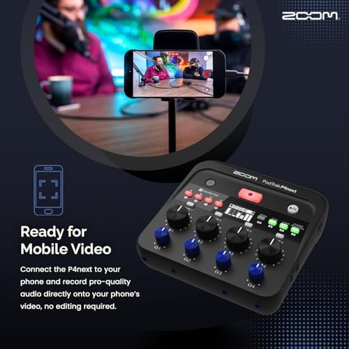 Zoom PodTrak P4next Podcast Recorder, Portable Multitrack Audio Recording w/ 4 Mic Inputs Includes Podcast Mic Pack, Rechargeable Batt, Headphone Hanger & More for Interviews, Remote Guest Recording