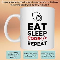This mug is made of thick, sturdy ceramic to ensure it lasts for many years of enjoyment. Enjoy the convenience of a mug that is both microwave-safe for heating and dishwasher-safe for cleaning. Eat sleep code repeat for software developers and programmers. Buy this programming mug as gift for your programmer friend or coworker buddy. Makes great coding gift for coders and programmers. Funny programming mug that software engineer can wear to show their love to coding. Funny programmer humor and software engineer mug. The simple, effective C-handle offers a comfortable holding experience for everyone.