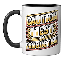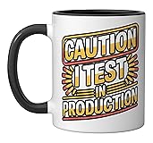 Make a statement that programmers will appreciate, warning of testing in live environments. For brave coders who live dangerously and push straight to production. 11-ounce ceramic mug is dishwasher and microwave-safe, lead and BPA free Features glossy finish with accent colors on interior, handle, and rim of two-tone designs