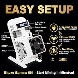- Experience the thrill of Bitcoin mining from the comfort of your home with the Bitaxe Gamma 601—designed for beginners, blockchain enthusiasts, and tinkerers who want to dive into solo mining without the hassle of industrial-grade equipment or sky-high electricity bills. Powered by a high-performance BM1370 ASIC chip optimized for SHA-256 mining, this compact, open-source miner delivers reliable hashrate performance (1TH/s to 1.2TH/s) with exceptional energy efficiency, making it the perfect entry point into the world of crypto mining. Product Specifications - Mining Algorithm: SHA-256 (Bitcoin/BTC) - Chip: BM1370 ASIC - Hashrate: 1TH/s – 1.2TH/s - Energy Efficiency: 15-16J/TH - Power Consumption: 18-20W - Connectivity: 2.4G WiFi - Display: 0.96” OLED (real-time hashrate, temperature, network status) - Software: AxeOS (open source, remote management, Stratum V1 support) - Included Accessories: 5V/5A Power Supply, Pre-Installed Mounting Stand, Quick-Start Guide - Color: White Whether you’re a beginner looking to experience solo Bitcoin mining for the first time, a blockchain enthusiast eager to learn the mechanics of mining, or a tinkerer who loves open-source customization, the Bitaxe Gamma 601 delivers accessibility, efficiency, and freedom—all in a home-friendly design. Unbox, connect, and start mining today!