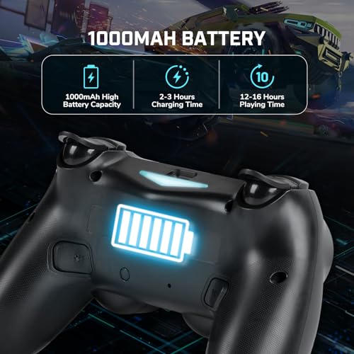 - 【Large-Capacity Battery】2-pack of PS-4 pro controllers features 1000mAh rechargeable battery and an upgraded USB-C charging port. 3H charge provides 10-15 hours of funny gameplay, meeting your long-lasting gaming needs. Perfect for enjoying instant fun with friends (includes charging cable).