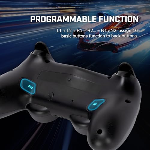 - 【Programmable Function】Wireless P-4 Controller feature 2 customizable back buttons (N1/N2), which can be programmed to replicate any of the 1-16 basic buttons(L1+L2+R1+R2....=N1/N2). The advanced chip ensures rapid response, allowing you to execute complex combos effortlessly and reduce finger fatigue.
