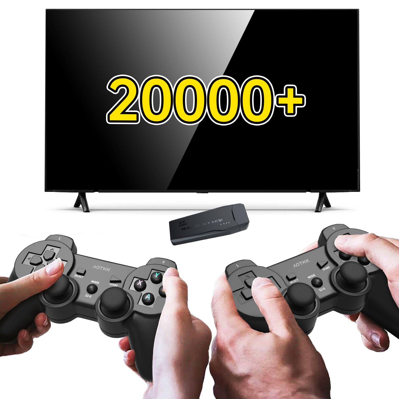 Wireless Retro Game Console Built in 20,000+ Games and 9 Emulators Retro Game Stick 4K HDMI Plug and Play Video Games for TV Dual 2.4G Wireless ControllersGet ready to game in just 4 simple steps! Your new retro gaming console is designed for instant setup – no tech skills required:1. **Insert the TF Card First**: Begin by placing the included TF card securely into the slot.2. **Connect to Your TV**: Plug the game stick directly into your TV’s HDMI port – works with most modern HD and 4K Smart TVs.3. **Power It Up**: Connect the USB cable to the adapter and power outlet. The retro game console turns on automatically.4. **Select & Play**: Use the wireless controller to browse games by system or title and jump right in!------------------------------------------------------------------**Technical Specifications – High-Performance Retro Gaming**- **Model Color**: Classic Black- **Dimensions**: 6.5 x 4.92 x 4.13 inches (Compact & Space-Saving)- **Weight**: 0.82 lbs (Lightweight & Portable)- **Storage**: 32/64/128GB TF Card (All Games Pre-Loaded)- **Max Output Resolution**: 4K Ultra HD with 1080P Support- **Wireless Tech**: 2.4GHz Dual Controllers (Lag-Free Gameplay)- **Compatibility**: HDMI-Enabled TVs, Monitors, and Projectors- **Game Count**: 32GB:10000+Classic Titles,64GB:18000+Classic Titles,128GB:23000+Classic Titles **What’s in the Box – Everything You Need Included**- 2 × 2.4GHz Wireless Game Controllers- 1 × Retro Game Console (Game Stick)- 1 × Wireless USB Receiver- 1 × USB Power Cable- 1 × High-Speed HDMI Cable - 1 × English Setup Guide- Note: Controller batteries not included. Requires 4 AAA batteries.