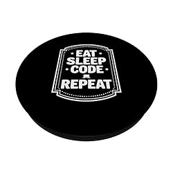 A bold Eat Sleep Code Repeat layout stacked in large rounded letters inside a framed border, accented by small dots and a tiny tech symbol in the center, all in clean black and white so the simple coding mantra stays clear, high contrast and easy to notice Made for programmers, software developers, IT students and tech fans who enjoy simple coder humor; suitable for long coding sessions, study days, office life, hackathons, game nights and everyday routines where a looping cycle of code and repeat feels Adhesive backing attaches the PopGrip to your case or device. Will not stick to silicone, leather, waterproof, or highly textured cases. Works best with smooth, hard, plastic cases. Not compatible with wireless charging Printed top is swappable with other compatible PopGrip models. Just press flat, turn 90 degrees until you hear a click and remove to swap.