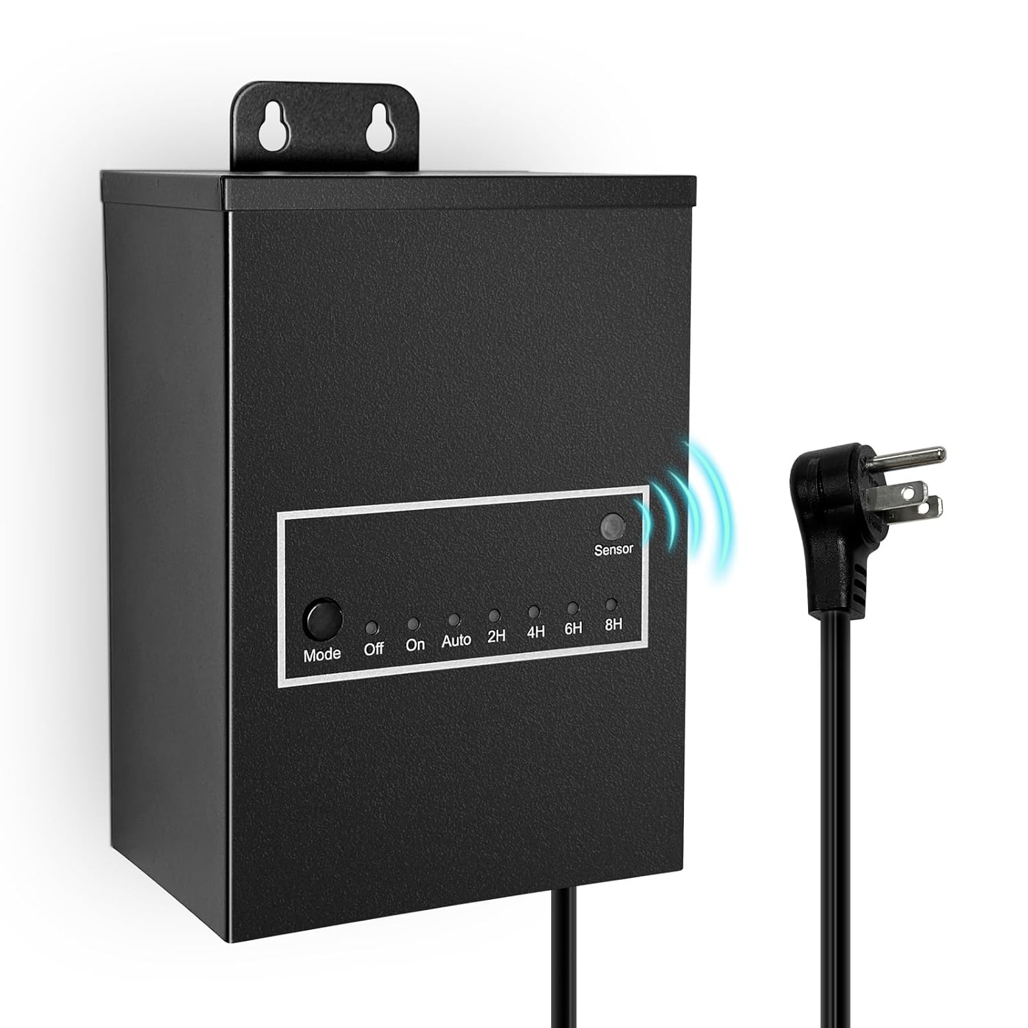 - Dusk to Dawn Sensor: Equipped with a high-speed sensing photocell sensor, the low voltage landscape transformer automatically turns on at dusk and off at sunrise. There is no need for manual switching, which improves convenience while helping to significantly reduce electricity bills and avoid unnecessary energy consumption