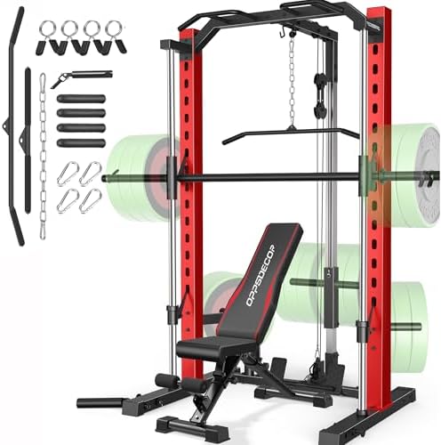 - 【Train All Your Muscles with One Machine】 All in 1 smith machine combines a squat rack, lat pull-down machine, power tower, landmine, 14 height adjustable pillars, and other free Accessories. It can do a variety of exercises, for example, wide & narrow lat pull-downs, 360° landmine, seated cable rows, bench presses, squats, pull-ups and more. Train all your muscles with one machine.