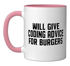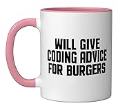 Will Give Coding Advice For Burgers - Funny saying for a programmer or coder, developer or software engineer, computer science or programming, technology or tech, code and IT student, professor or graduation! Humorous outfit or decoration for men and women! CLICK ON OUR BRAND NAME ABOVE FOR MORE PROGRAMMER & SOFTWARE ENGINEER SAYINGS, ITEMS & COLORS! 11-ounce ceramic mug is dishwasher and microwave-safe, lead and BPA free Features glossy finish with accent colors on interior, handle, and rim of two-tone designs