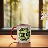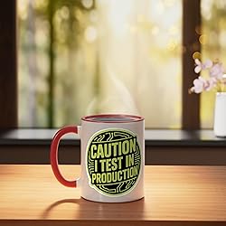 Make a statement that programmers will appreciate, warning of testing in live environments. For brave coders who live dangerously and push straight to production. 11-ounce ceramic mug is dishwasher and microwave-safe, lead and BPA free Features glossy finish with accent colors on interior, handle, and rim of two-tone designs