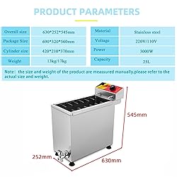 - Features: Material: The machine is made of stainless steel, which is durable and has a long service life. Large capacity: 25L capacity, even heating. Product name: cheese hot dog stick fryer, hot dog machine, corn hot dog fryer Easy to take out: quickly and easily accommodate 2 rows of 12 hooks and take out food Stability: Non-slip adjustment feet keep the machine stable. Use: Suitable for restaurants, snacks, street food, food trucks, bars. Specifications: Name: Cheese hot dog stick fryer Material: stainless steel Rated power: 3 kW/1.8KW Rated voltage: 220V/110V Heating method: electric heating Frying capacity: 25L Product size; 252*630*545MM Weight: 13KG Packing list: 1 x Corn hot dog fryer