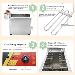 【Multi-function Hot dog Machine】The commercial electric hot dog fryer has a large capacity of 25L. It only takes a few minutes to make 12 delicious corn dogs at 1 time. 2 rows of 12 hooks can quickly and easily clamp and remove food, saving waiting time. 【Adjustable Temperature】 50-200℃ adjuatable temperature control. Heating quickly and evenly, the temperature can be easily adjusted by buttons to meet your different needs when frying food. The body of cheese hot dog sticks maker is made of stainless steel, easy to clean, and long service life. 【Safety】The unit has a minimum and maximum oil fill line on the fryer tank for precise operation. For safety, the fryer is equipped with a lid to protect the oil from contaminants when not in use. The front - mounted ball valve oil drain valve makes emptying and cleaning easy and includes a slide bit lock to prevent accidental drainage. 【Anti-slip and Stable】The corn hot dog machine has non-slip feet, which can be placed firmly on any table, providing stability during operation, always ensuring your safety. The faucet drainage is convenient for oil change. 【Widely Used】The cheese hot dog stick fryer can fry food, make cheese hot dog sticks and more, very suitable for commercial and home use, such as fast food restaurants, snack bars, cafes, parties, snacks, street snacks, food trucks, bars.