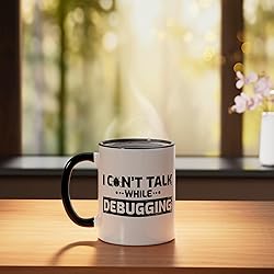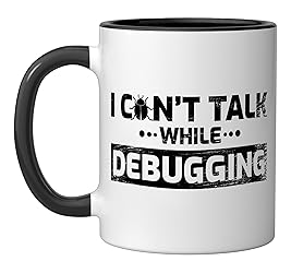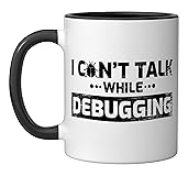 This funny programmer t-shirt "I Can't Talk While Debugging" is the perfect software developer gift who likes coder jokes. Now wear this funny Developers Outfit while programming on your Computer or PC. This funny Developer Quote t-shirt is the perfect gift for software programmers and coders. Nerd clothing for men, women, boys, girls or children. Computer Geek gift idea for Christmas, birthday, father's day or mother's day. 11-ounce ceramic mug is dishwasher and microwave-safe, lead and BPA free Features glossy finish with accent colors on interior, handle, and rim of two-tone designs