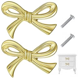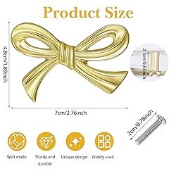 Premium Material: These gold dresser knobs are made of premium zinc alloy material, which are sturdy and reliable, glossy and smooth, not easy to break, deform or damage, can be used for a long time. Unique Bow Design: The drawer pulls feature a delicate gold bow shaped design, fine polished brass texture makes these brass bow knobs rich in exquisite golden luster, adding a touch of elegance and sophistication to any room. Easy to Install: Find the position where you want to install cabinet pull and drill a hole, then pass through the screw from the back of board and thread tight to the gold drawer knobs. Wide Application: These bow dresser handles are ideal for various furniture, such as cabinets, wardrobes, dressers, drawers, cupboards pulls and other furniture, offering a stylish and functional solution for enhancing your home decor. Package Includes: You will receive 2 pieces of gold brass bow knobs with 2 pieces screws, each size is about 7 x 4.8 x 2.1 cm/2.76 x 1.89 x 0.83 inches. It is very suitable for replacing damaged handles on existing cabinets, giving your furniture a new look instantly.