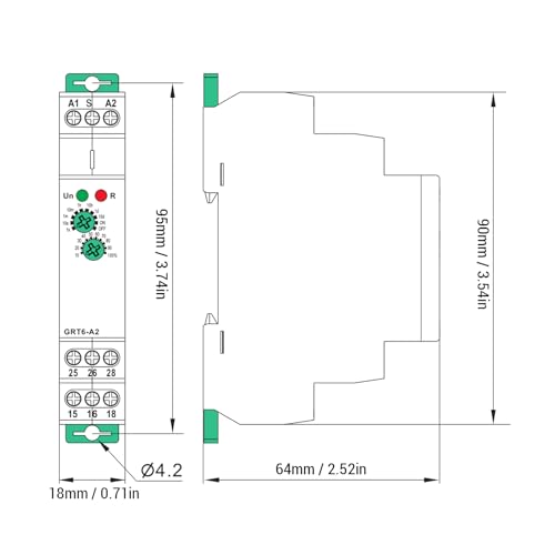 Spec: Item Type: Time Delay Relay Material: PC Function: A: Delay ON Power Supply Terminals: A1-A2 Load: AC 0.09-3VA, DC 0.05-1.7W Power Supply Voltage Tolerance: -15%, +10% Power Indicator: Green LED Time Range: 0.1s-10days, ON, OFF Time Setting: Potentiometer Time Deviation: 10% Mechanical Setting Repetition Accuracy: 0.2% Set Value Stability Temperature Coefficient: 0.05%/℃, at=20℃ (0.05%℉, at=68℉) Output: 1xSPDT Current Strength: 10A/AC1 Switch Voltage: 250VAC, 24VDC DC Minimum Switching Power: 500mW Output Indicator: Red LED Mechanical Life: 10000000 Electrical Life (AC1): 100000 Reset Time: Maximum 200ms Operating Temperature: -20℃-+55℃ (-4℉-131℉) Storage Temperature: -35C-+75℃ (-22℉-158℉) Mounting, Rail: Guard Class EN or IEC60715 Guard Class: Front Panel IP40, Terminal IP20 Operating Position: Any Overvoltage Category: III Maximum Cable Size (mm²): Solid Wire Maximum 1 x 2.5 or 2 x 1.5, With Sheath Maximum 1 x 2.5 (AWG12) Torsion: 0.4Nm Package List: 1 x Time Relay 1 x Manual How To Use: 1. The product must be installed by a qualified electrician. 2. All electrical connections to the product must . 3. All and any electrical connections to the product must with the appropriate safety standards.