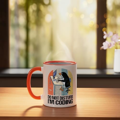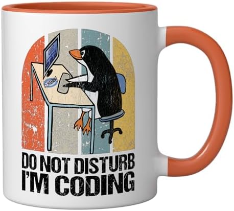 Do Not Disturb I'm Coding Programmer Retro Developer Penguin Ceramic Mug, Orange/White